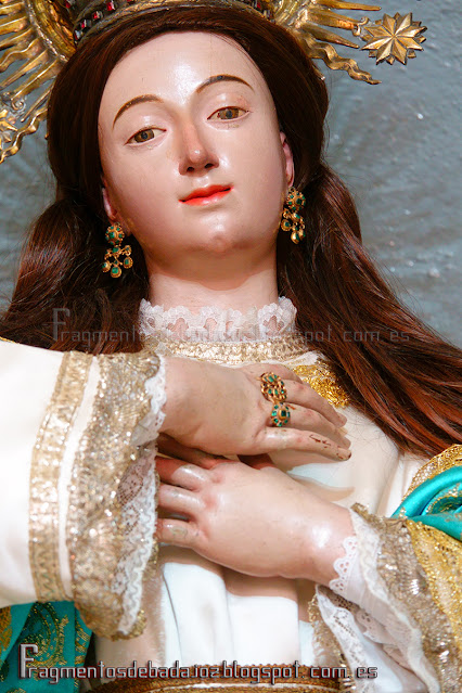 - Las manos junto al pecho en las Inmaculadas, que muestran un gesto de humildad. Pocas vemos con las manos juntas al estilo de la Virgen (de la Encarnación) de Bótoa de Badajoz.
