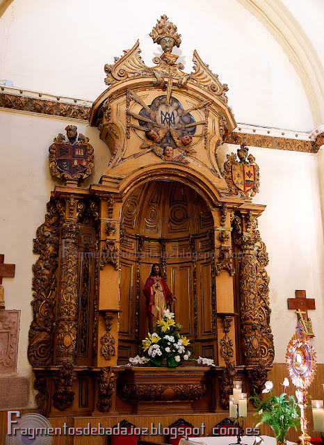 Casi con toda seguridad, el retablo dieciochesco donde actualmente está el sagrario, en el lado de la epístola del presbiterio, era el primitivo donde estaba el Amarrado. Sobre el baldaquino saliente, figuran los símbolos de la pasión como una columna y los látigos. Seguramente fue traslado del antiguo hospital hasta la parroquia, como se hizo con el Amarrado. En los extremos del ático figuran los escudos nobiliarios de las familias que lo donarían sobre 1723-26. Puede ser obra del escultor pacense Cristóbal Jiménez Morgado, pues la decoración floral blanca sobre fondo rojo que posee es muy similar al retablo de Santiago que el propio escultor hizo en la parroquia entre 1718 y 1719. Al menos puede ser del mismo pintor y/o dorador. Por supuesto, tampoco descarto al taller de Ruiz Amador. Hoy vemos en él una imagen moderna del Sagrado Corazón de Jesús.